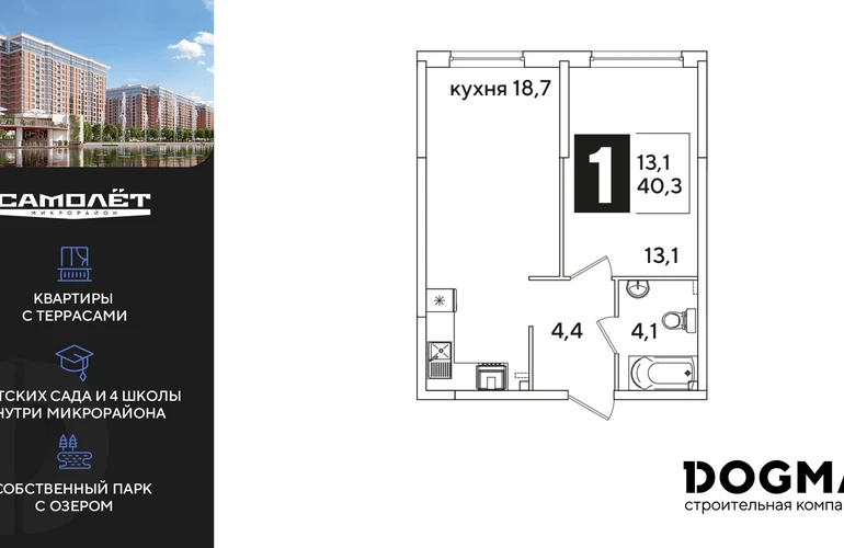 1-ком, 40.3 кв.м., 1/16эт.