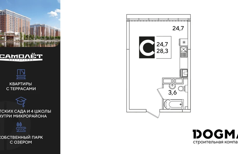 Студия, 28.3 кв.м., 16/16эт.