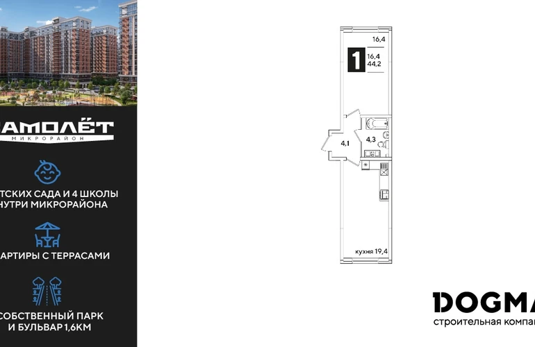 1-ком, 43.8 кв.м., 3/16эт.