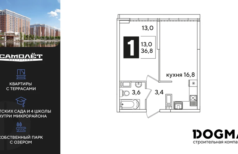 1-ком, 36.5 кв.м., 16/16эт.