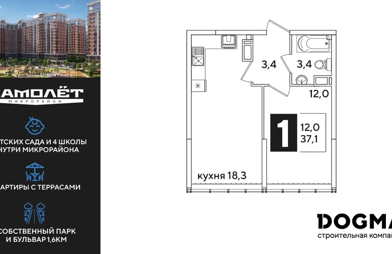 1-ком, 36.7 кв.м., 15/16эт.