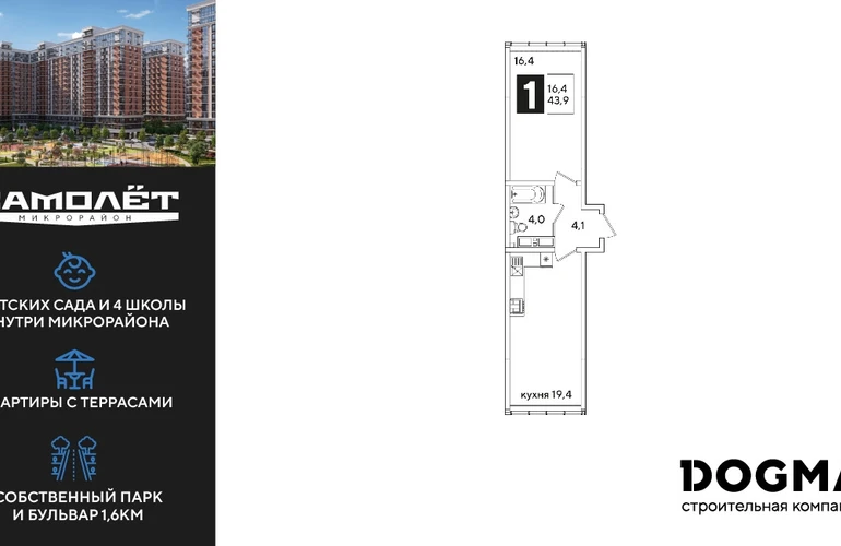 1-ком, 43.4 кв.м., 15/16эт.