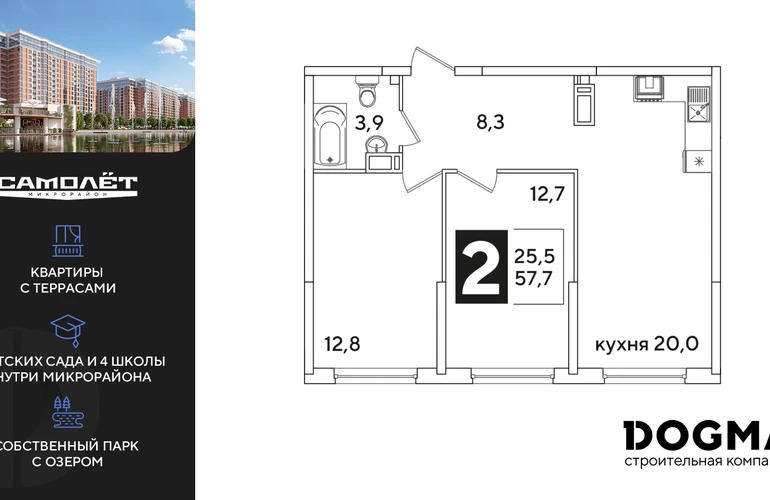2-ком, 57.3 кв.м., 11/16эт.
