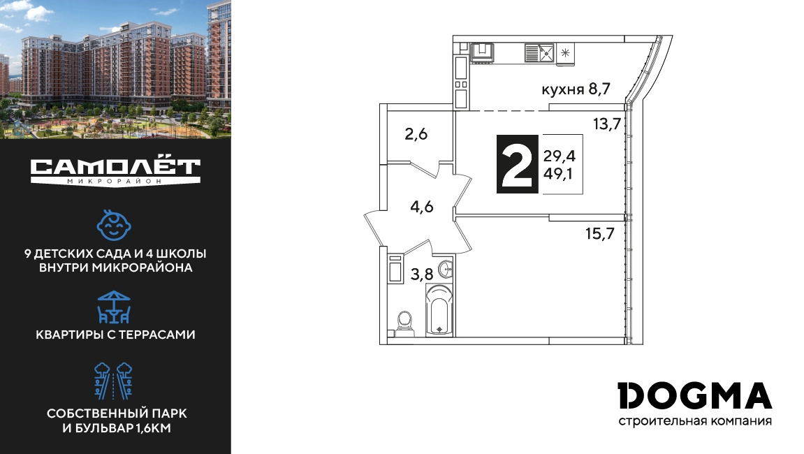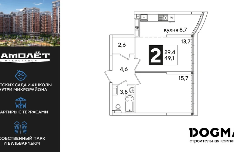 2-ком, 49.1 кв.м., 16/16эт.