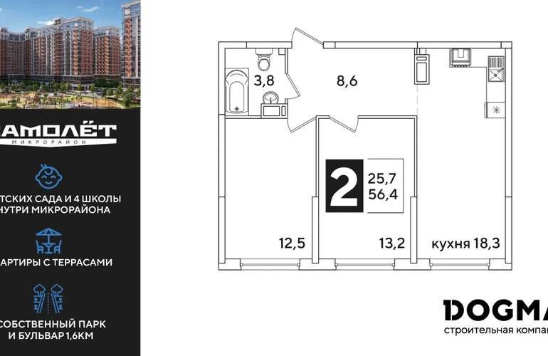 2-ком, 56.4 кв.м., 12/16эт.