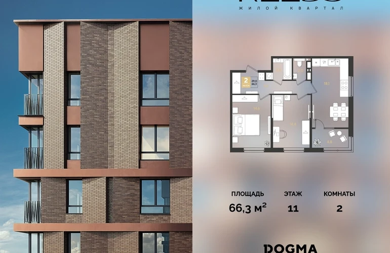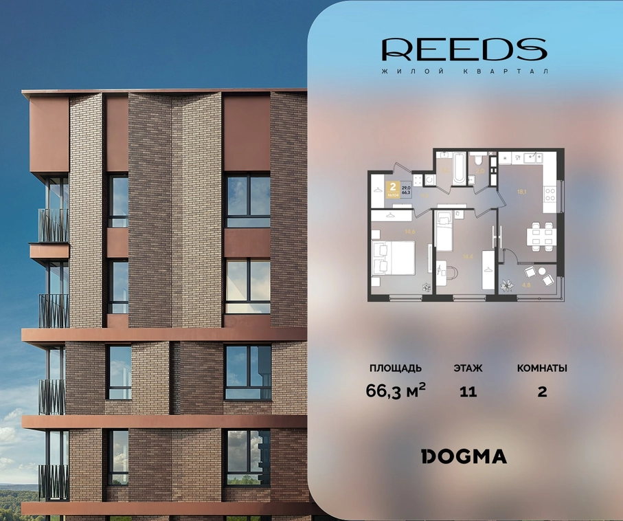 Срок сдачи: (4 кв. 2028, общей площадью 66.3 кв.м., на 11 этаже.)