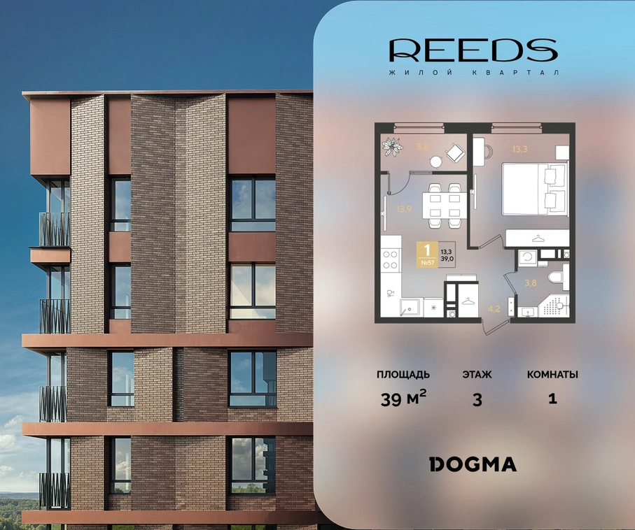 В продаже 1-комнатная квартира от застройщика DOGMA!ЖК REEDS, г. Краснодар, Литер 4