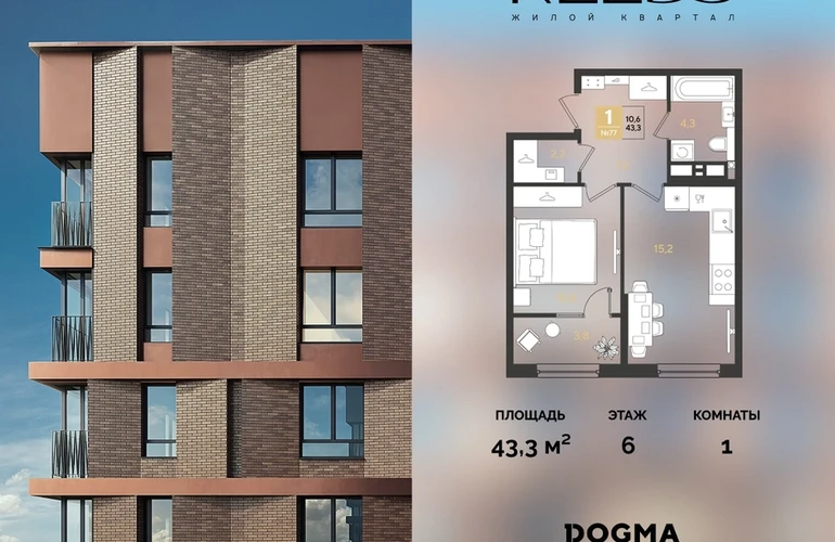 Срок сдачи: (4 кв. 2028, общей площадью 43.3 кв.м., на 6 этаже.)