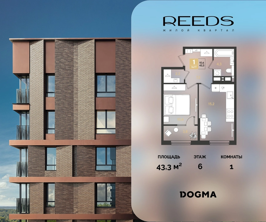 В продаже 1-комнатная квартира от застройщика DOGMA!ЖК REEDS, г. Краснодар, Литер 4