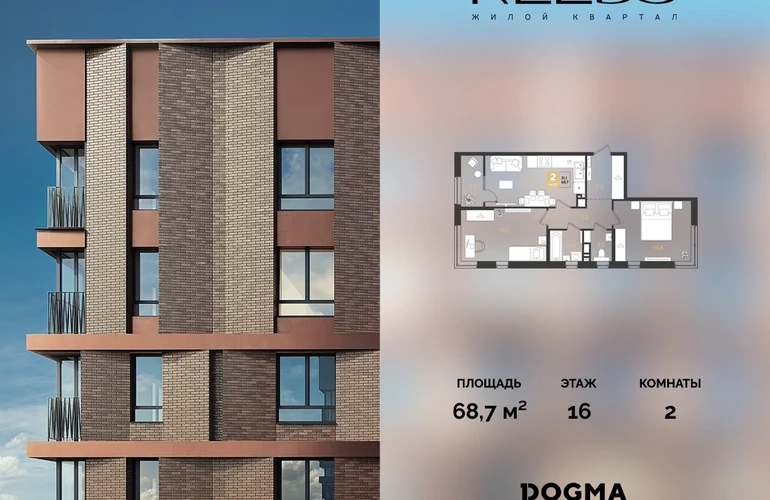 Срок сдачи: (4 кв. 2028, общей площадью 68.7 кв.м., на 16 этаже.)