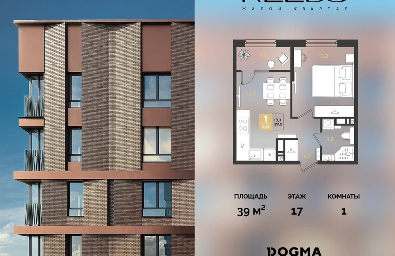 Срок сдачи: (4 кв. 2028, общей площадью 39 кв.м., на 17 этаже.)