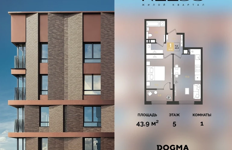 Срок сдачи: (4 кв. 2028, общей площадью 43.9 кв.м., на 5 этаже.)