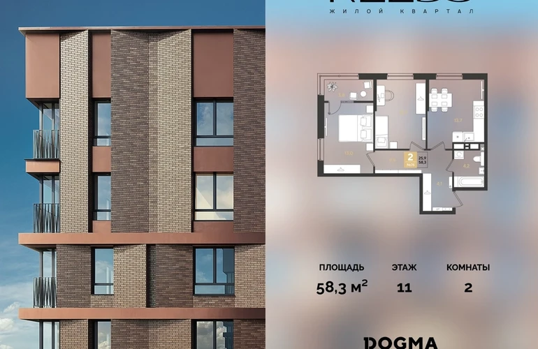 Срок сдачи: (4 кв. 2028, общей площадью 58.3 кв.м., на 11 этаже.)