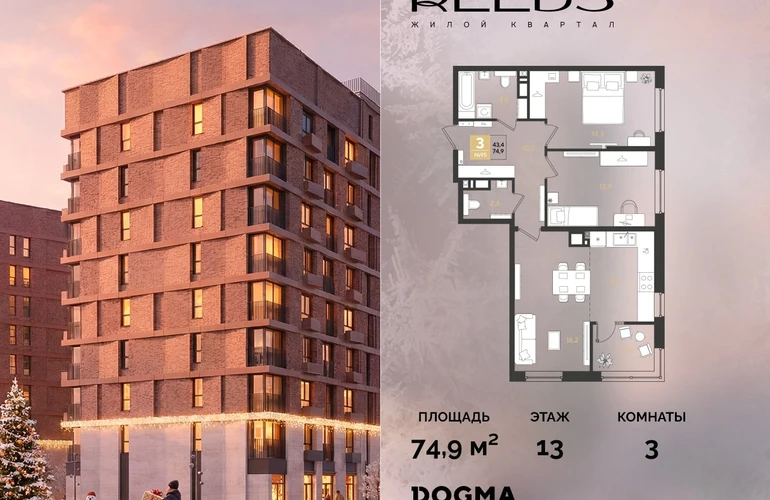 В продаже 3-комнатная квартира от застройщика DOGMA!ЖК REEDS, г. Краснодар, Литер 5
