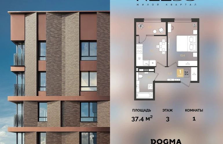 В продаже 1-комнатная квартира от застройщика DOGMA!ЖК REEDS, г. Краснодар, Литер 14