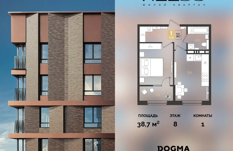 Срок сдачи: (4 кв. 2028, общей площадью 38.7 кв.м., на 8 этаже.)